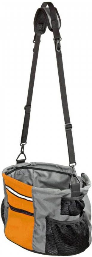 Hondenfietsmand Stuur Grijs Oranje- Tot 7 kg- Afmeting 38 x 30 x 25 cm Deze fietsmand is gemaakt van nylon, is reflecterend en is opvouwbaar. De mand is eenvoudig te bevestigen aan het stuur door middel van een KLICKfix adapter. De fietsmand is voorzien van een handige draag- en schouderriem. In de fietsmand zit een verstelbare riem met karabijnhaak voor extra veiligheid. Ook is de fietsmand te wassen op 40 graden. .